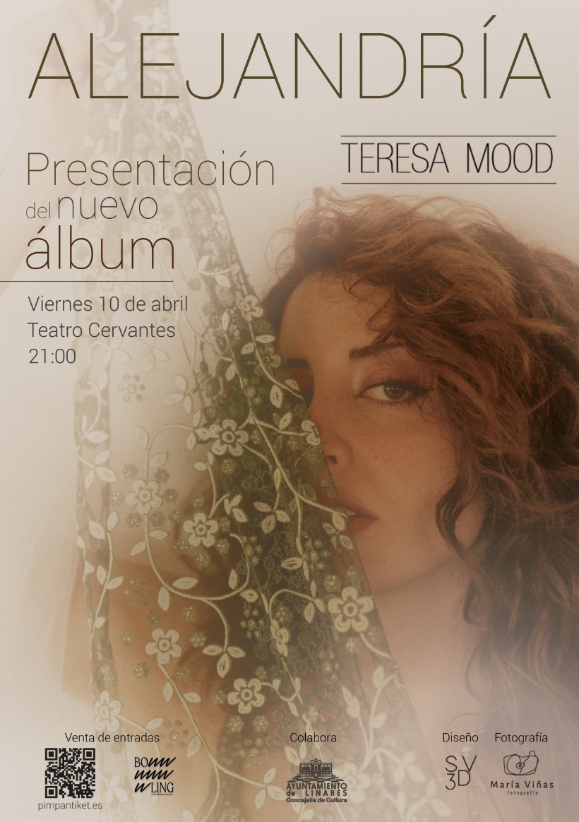 Teresa Mood presenta "Alejandría", su nuevo álbum, en un concierto único el próximo 10 de abril a las 21h en el Teatro Cervantes de Linares. Una noche para dejarse llevar por un sonido íntimo y elegante donde el jazz, el bolero y el soul en español se entrelazan con emoción y personalidad en formato de banda completa: ● Piano: Gabriel Peso (David Bisbal, Rosana) ● Bajo: Fiti Esteban (Chico Pérez, Mejillones Tigre) ● Trompeta: Silvano Herman (Universidad de las Artes de La Habana, Cuba (ISA) ● Percusión: “Zeke” Olmo (Eskorzo) El concierto contará además con artistas invitados como Javi Shidow, la magnífica coral "Andrés Segovia" o Carlitos Hojas, junto a otras colaboraciones sorpresa que harán de la velada una experiencia irrepetible.